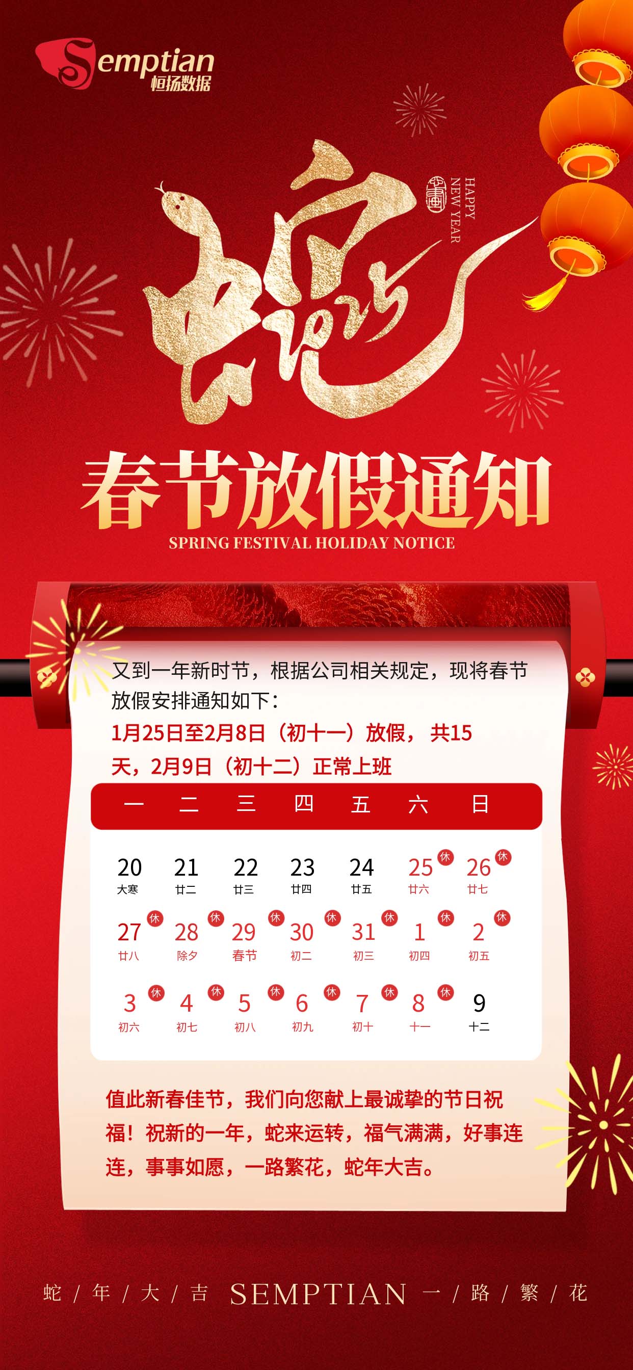 返回列表春節(jié)將至,根據(jù)公司相關(guān)規(guī)定,現(xiàn)將春節(jié)放假安排通知如下:1月25日至2月8日(初十一)放假, 共15天,2月9日(初十二)正常上班。值此新春佳節(jié),我們向您獻(xiàn)上最誠(chéng)摯的節(jié)日祝福!祝新的一年,蛇來(lái)運(yùn)轉(zhuǎn),福氣滿滿,好事連連,事事如愿,一路繁花,蛇年大吉。